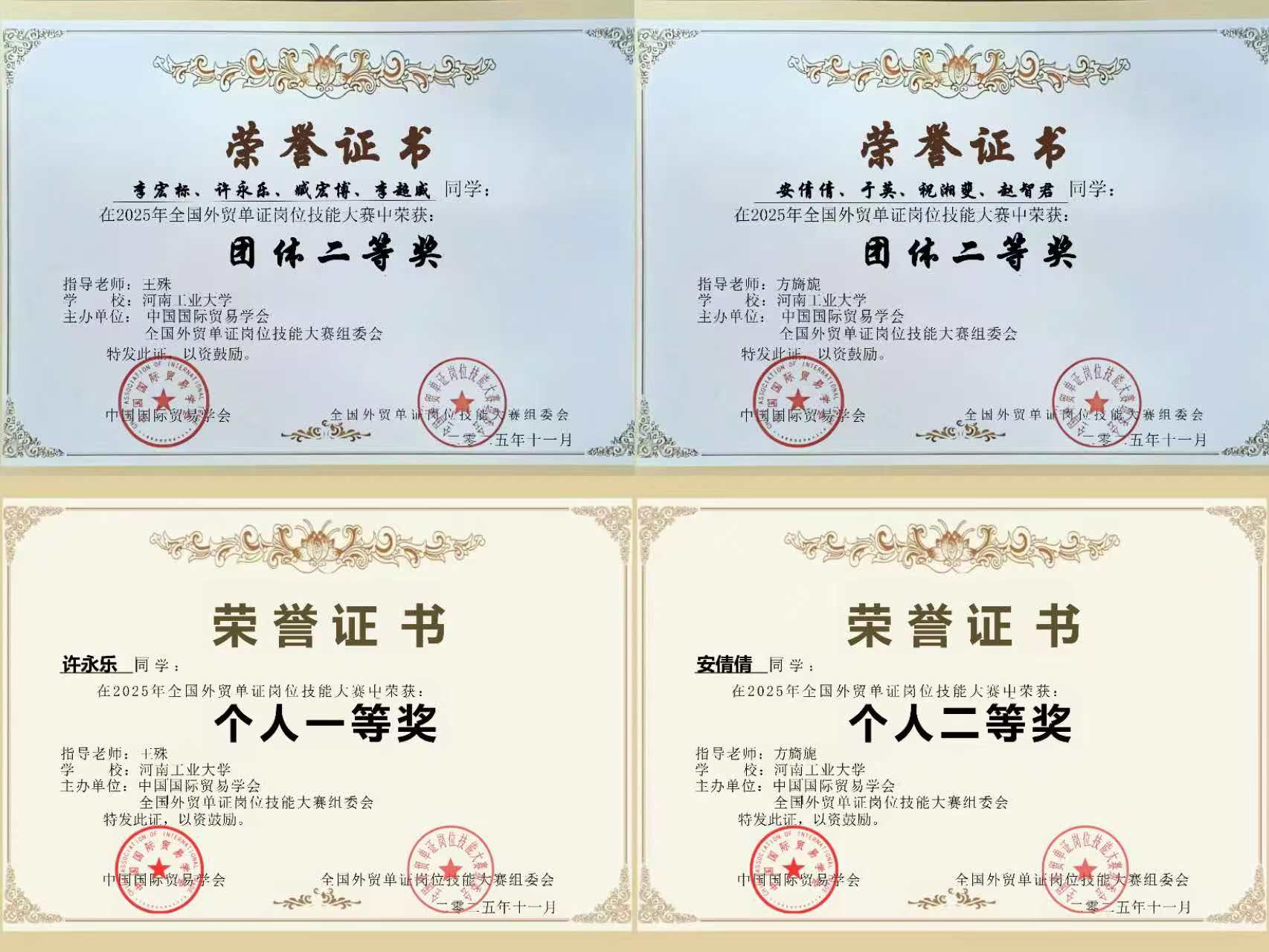近日,2025年“智欣联创”杯全国外贸单证岗位技能大赛落下帷幕。本届大赛汇聚了全国三十余所院校的300余名选手参与角逐,我院学子凭借扎实的专业能力与充分的赛前准备,在比赛中斩获多项荣誉。其中,“单证鬼才队”、“第一梯队”团队荣获全国团体二等奖,许永乐获个人一等奖,另有多支团队及同学分获团体三等奖与个人二、三等奖,王殊、方旖旎、王明涛、鲁慧鑫、张小蒙获评“优秀指导教师”。