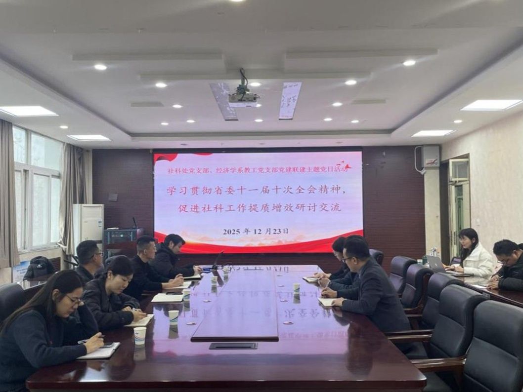 12月23日下午,社会科学处党支部与经济学系教工党支部在博识楼3501会议室共同开展“学习贯彻省委十一届十次全会精神,促进社科工作提质增效研讨交流”党建联建主题党日活动,以“党建+社科”深度融合为切入点,共话协同发展路径,共商提质增效举措。